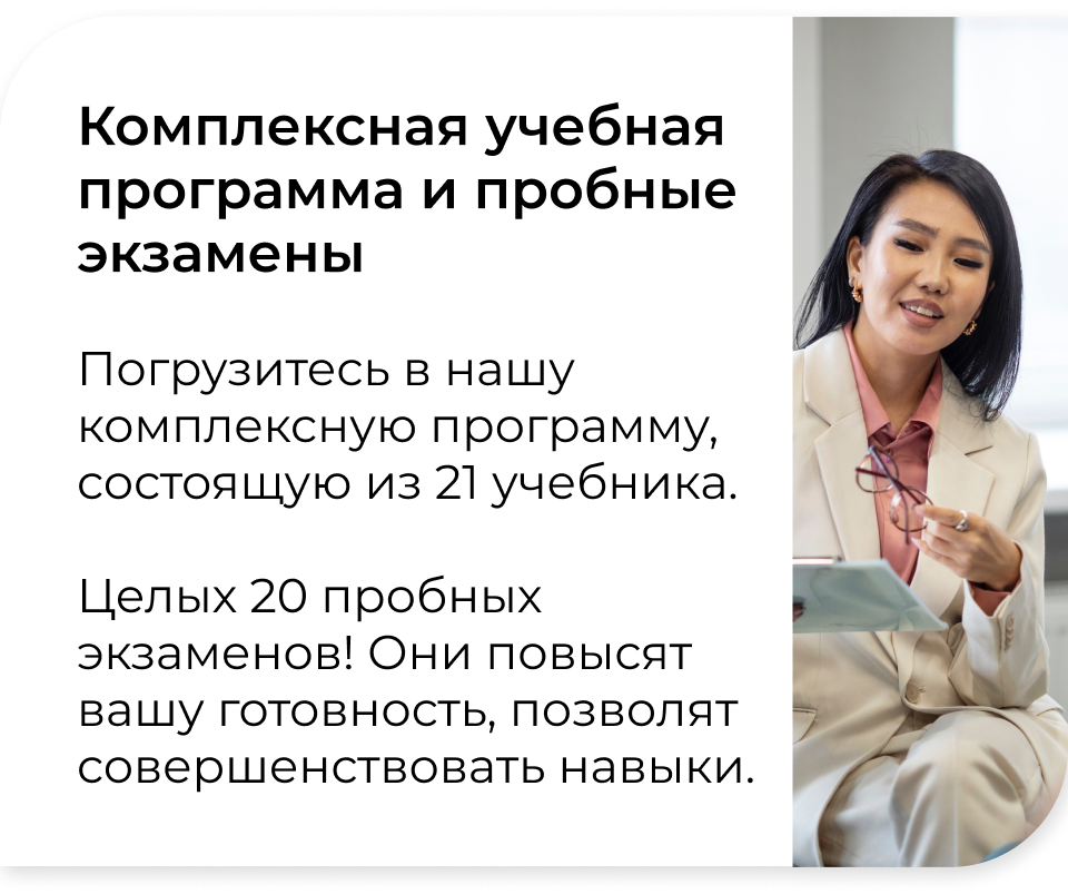 Погрузитесь в нашу комплексную учебную программу, состоящую из 21 учебника. Целых 20 пробных экзаменов! Они повысят вашу готовность, а также позволят вам совершенствовать навыки.