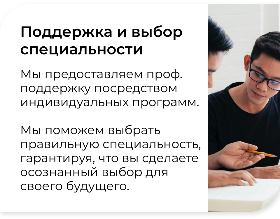 Мы предоставляем проф. поддержку посредством индивидуальных программ обучения. Специалисты помогут выбрать правильную специальность, гарантируя, что вы сделаете осознанный выбор для своего будущего.