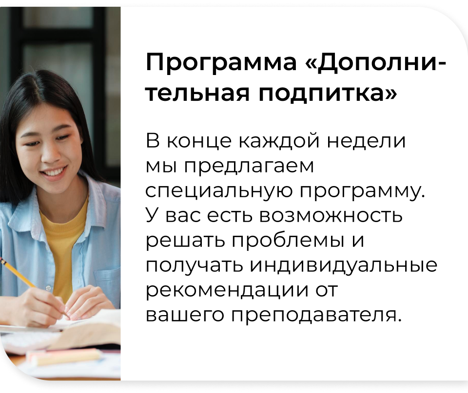 В конце каждой недели мы предлагаем специальную программу. У вас есть возможность решать проблемы и получать индивидуальные рекомендации от вашего преподавателя.