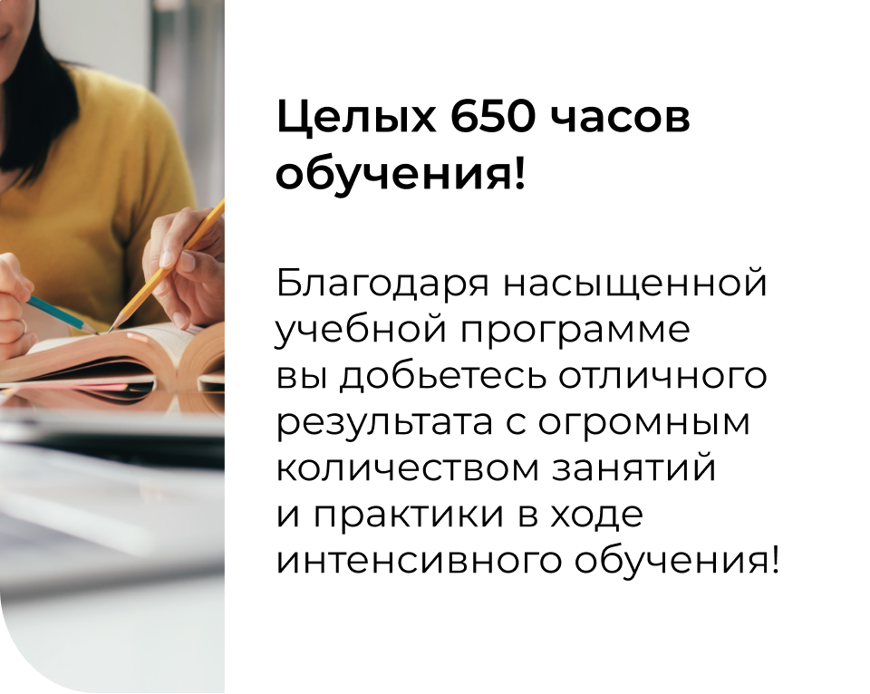 Благодаря насыщенной учебной программе вы добьетесь отличного результата с огромным количеством занятий и практики в ходе интенсивного обучения!